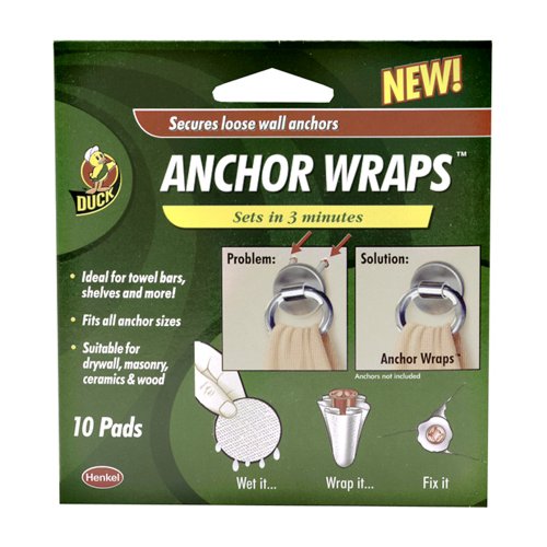 "DUCK" WALL ANCHOR WRAPSSecures loose wall anchorsSets in 3 minutesFits all anchor sizesSuitable for drywall,masonry, ceramics, and woodIdeal for pictures, towelracks, shelves, and moreEasy to apply10 padsCarded